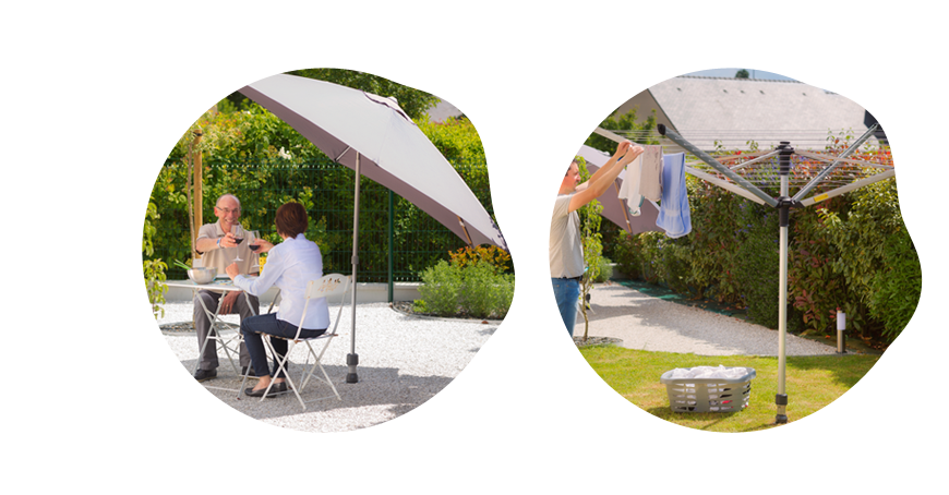 Voor kleine buitenruimten, bijvoorbeeld bij stadswoningen, kan u één enkele verankeringsbasis maken en vervolgens uw uitrustingen wijzigen. Bijvoorbeeld, een drooglijn 's morgens, een rechte parasol 's namiddags en een Gard&Rock tuinverlichting 's avonds. Met andere woorden kan u zelfs in een beperkte ruimte talrijke activiteiten organiseren.