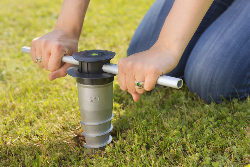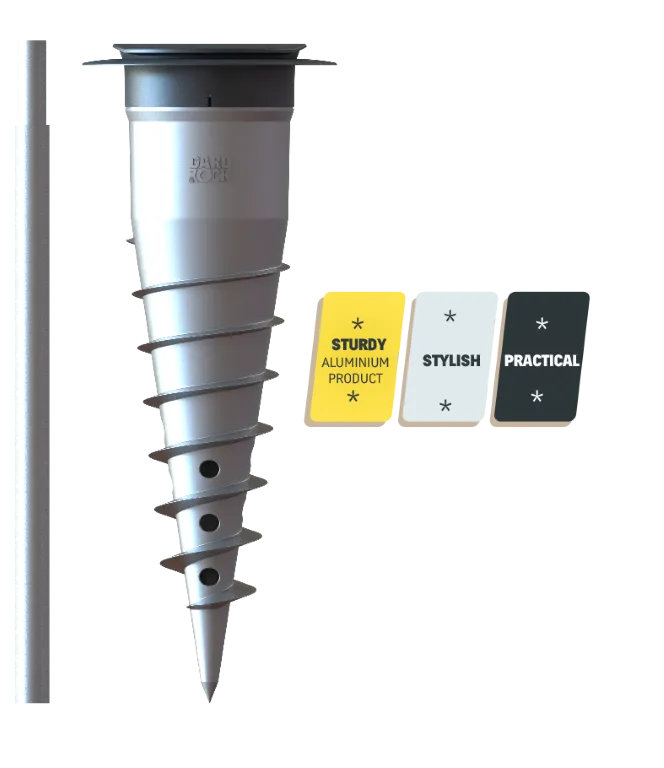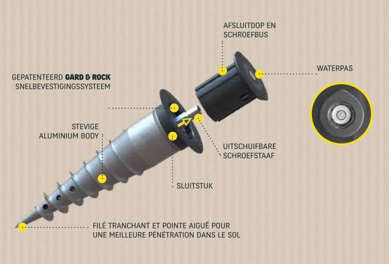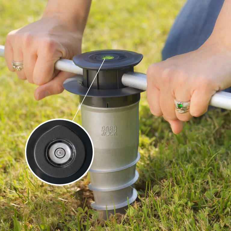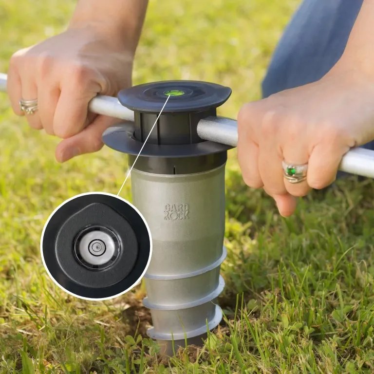 Schroef de verankeringsbasis rechtstreeks vast op uw terrein (gazon, perk, aarde, gestabiliseerd zand...) met de verankeringsstaaf. De ingebouwde waterpas verzekert een nauwkeurige verticale bevestiging op platte en zelfs hellende ondergronden! Eens uw uitrusting in de grond zit, staat deze mooi recht. Indien dit volgens het stabiliteitsniveau van uw grond nodig is, is de Gard&Rock-bevestigingspoot eveneens geschikt voor betonverzegeling. De werkwijze staat in de handleiding beschreven en we nodigen u uit om deze video te bekijken: