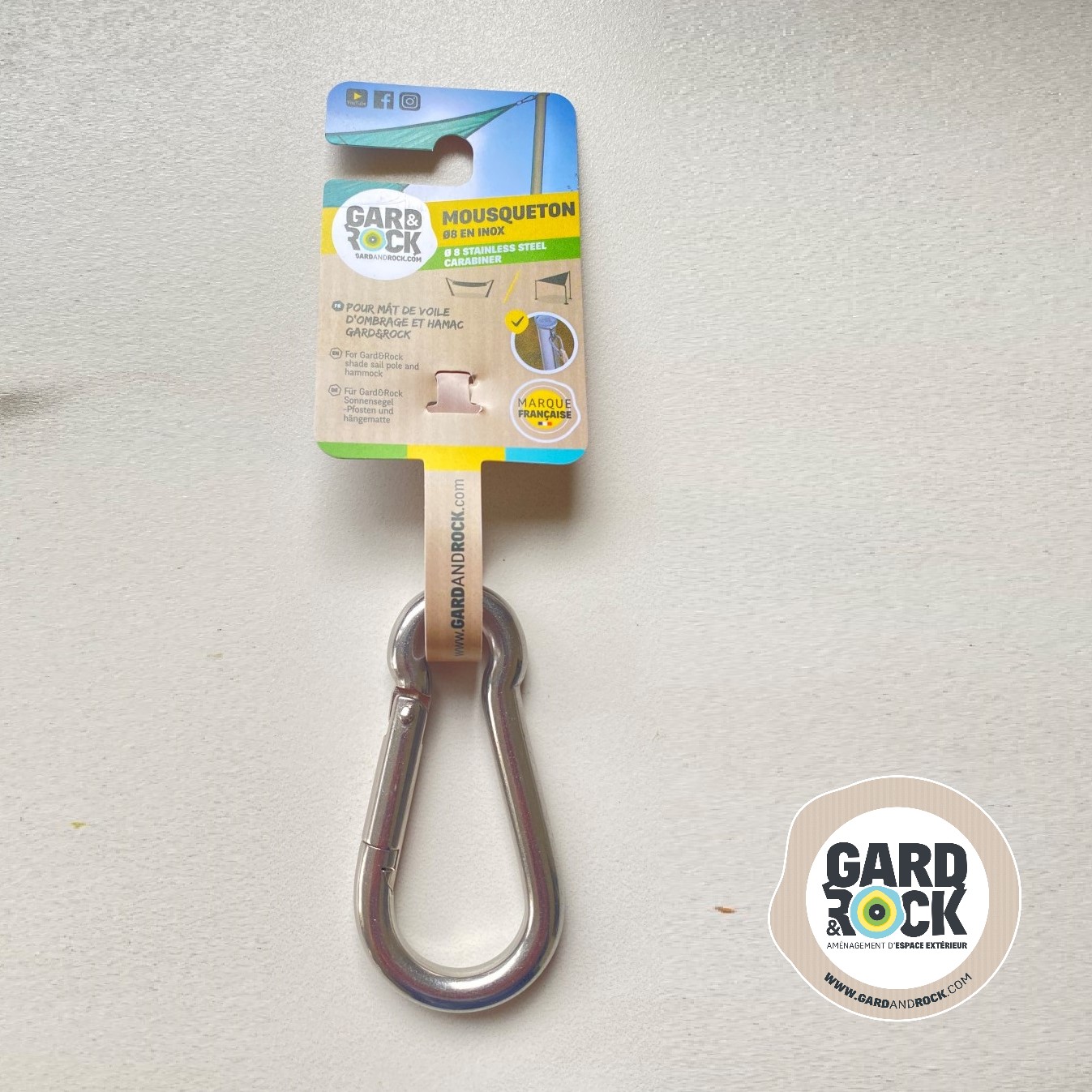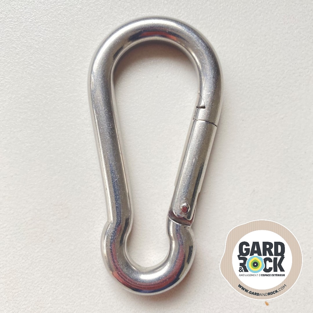 Met deze musketon uit roestvrij staal kan u uw schaduwdoek en hangmat op een stevige, esthetische en verwijderbare manier vastmaken.