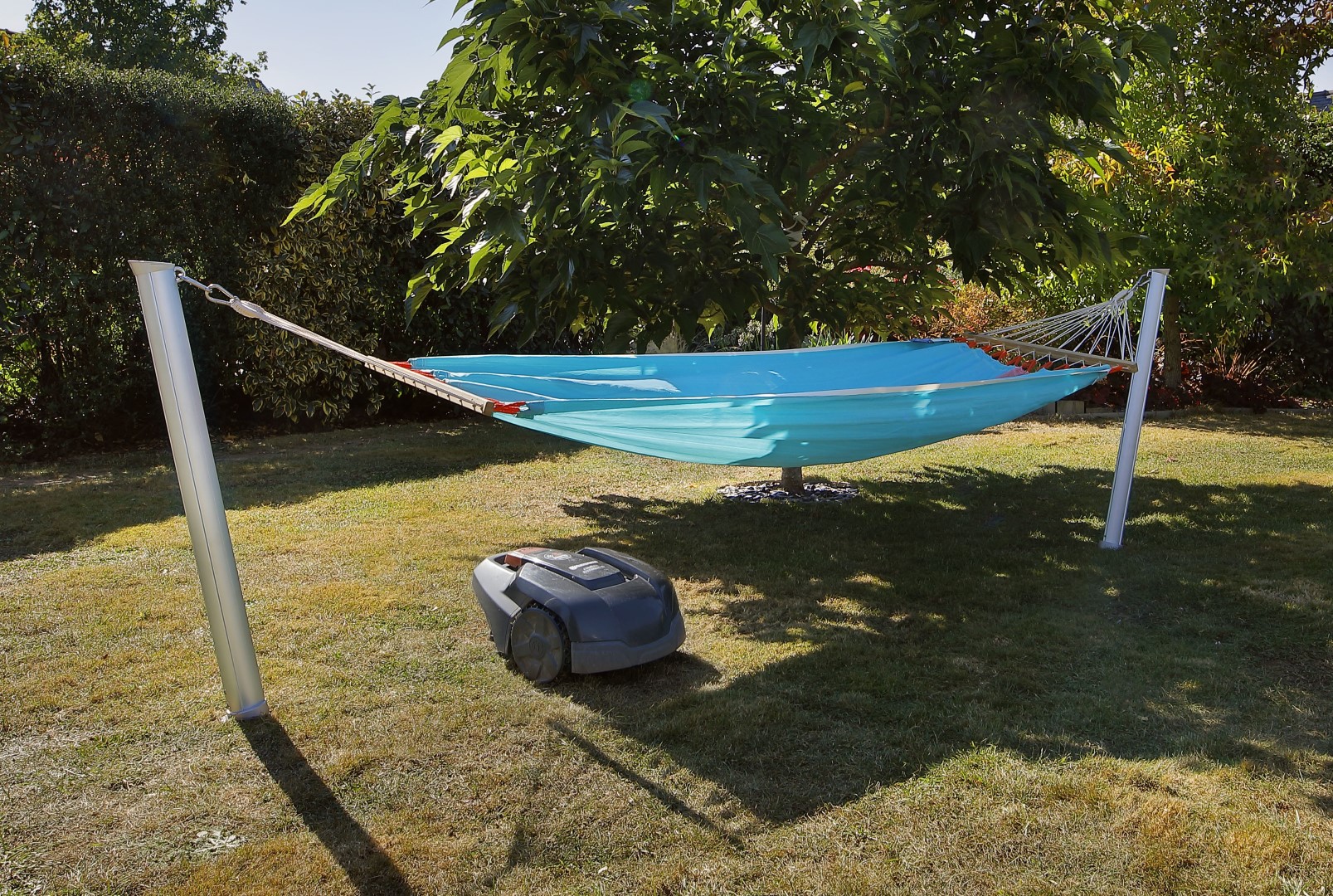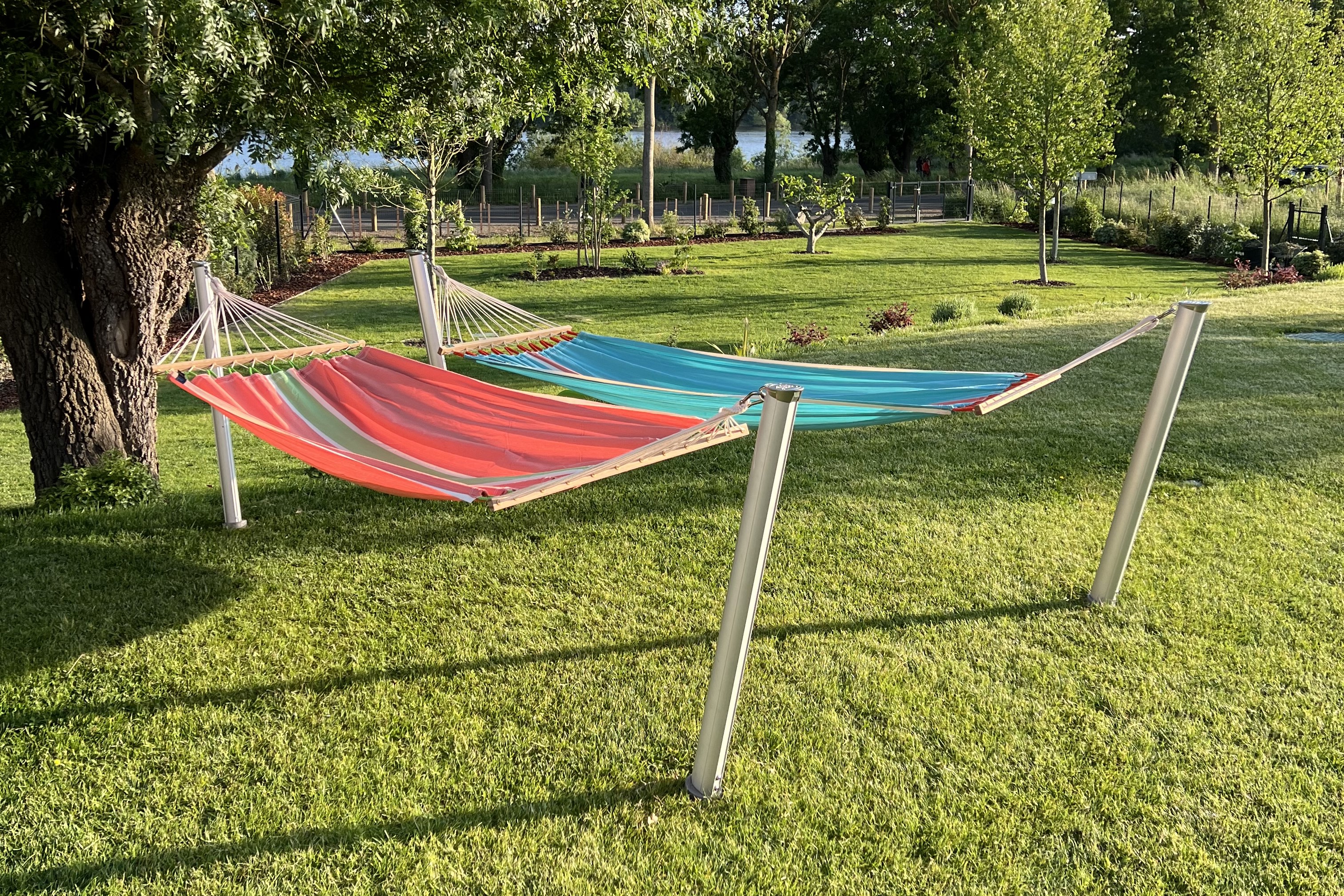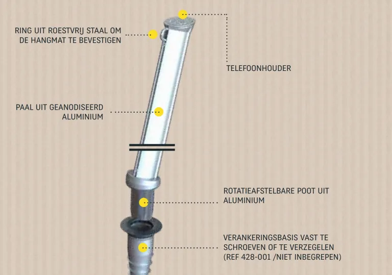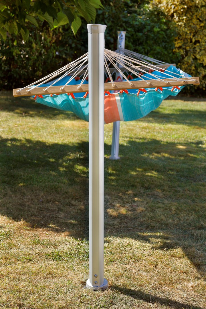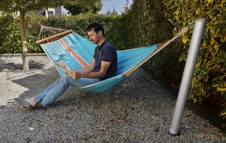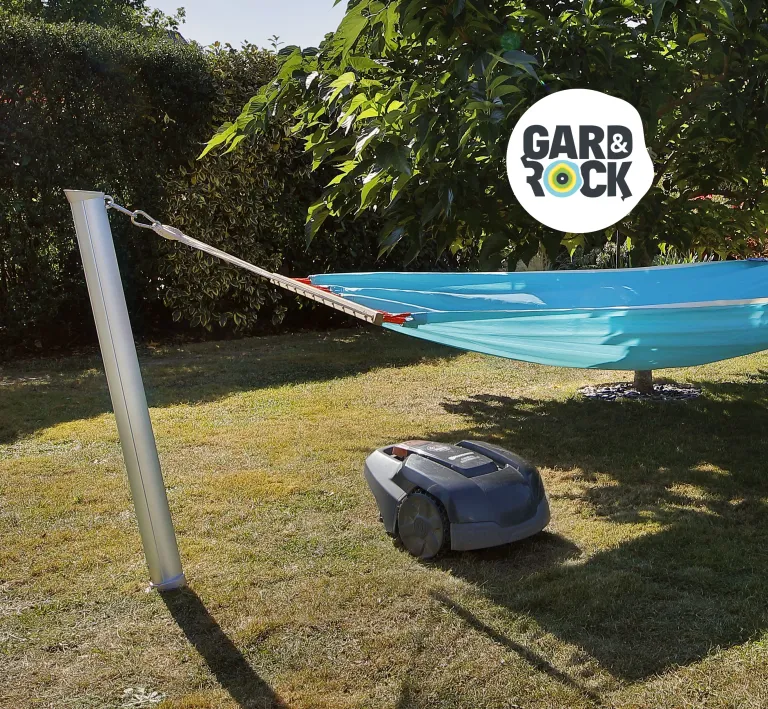 De Gard&Rock-paal voor de hangmatbevestiging, een Frans ontwerp uit geanodiseerd aluminium en verchroomde legering (één enkele persoon, max. belasting van 100kg) is ontworpen om lang mee te gaan. Daarenboven zorgt zijn inclinatie niet alleen voor meer stevigheid maar ook voor een mooie integratie in een minerale omgeving of in een omgeving met een weelderige plantengroei.