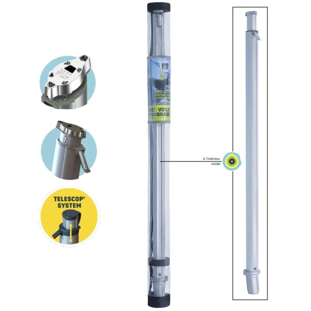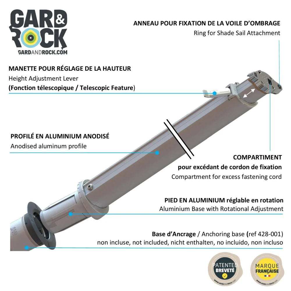 De GARD&ROCK palen zorgen overal voor een snelle en gemakkelijke bevestiging van de schaduwdoeken in uw buitenruimte (terras, gazon, veranda, zwembad...). Ons gepatenteerd systeem biedt een verwijderbare verankering om uw inrichting te moduleren of om uw terrein in een oogwenk vrij te maken. Met de uitschuifbare paal kan u zijn hoogte naar wens regelen. U geniet van een stijlvol en stevig product van hoge kwaliteit dat in Frankrijk ontworpen is. Een onmisbaar accessoire om aangename momenten door te brengen in optimale omstandigheden, beschut tegen de uv-stralen.