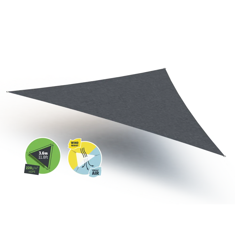 Kies voor een efficiënte en stijlvolle schaduwoplossing. Met de driehoekige Gard&Rock-doeken van 3.6*3.6*3.6m beschermt u zich tegen de zon en geeft u uw tuin een decoratieve toets. In combinatie met de palen kan u overal in uw buitenruimte schaduwzones aanbrengen. Dit product is gemaakt uit HDPE 220g/m2 met microperforaties waardoor u over een kwaliteitsvol product beschikt met een grafietkleur.