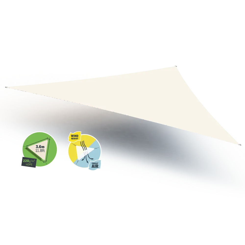 Kies voor een efficiënte en stijlvolle schaduwoplossing. Met de driehoekige Gard&Rock-doeken van 3.6*3.6*3.6m beschermt u zich tegen de zon en geeft u uw tuin een decoratieve toets. In combinatie met de palen kan u overal in uw buitenruimte schaduwzones aanbrengen. Dit product is gemaakt uit HDPE 220g/m2 met microperforaties waardoor u over een kwaliteitsvol product beschikt met een ivoor.