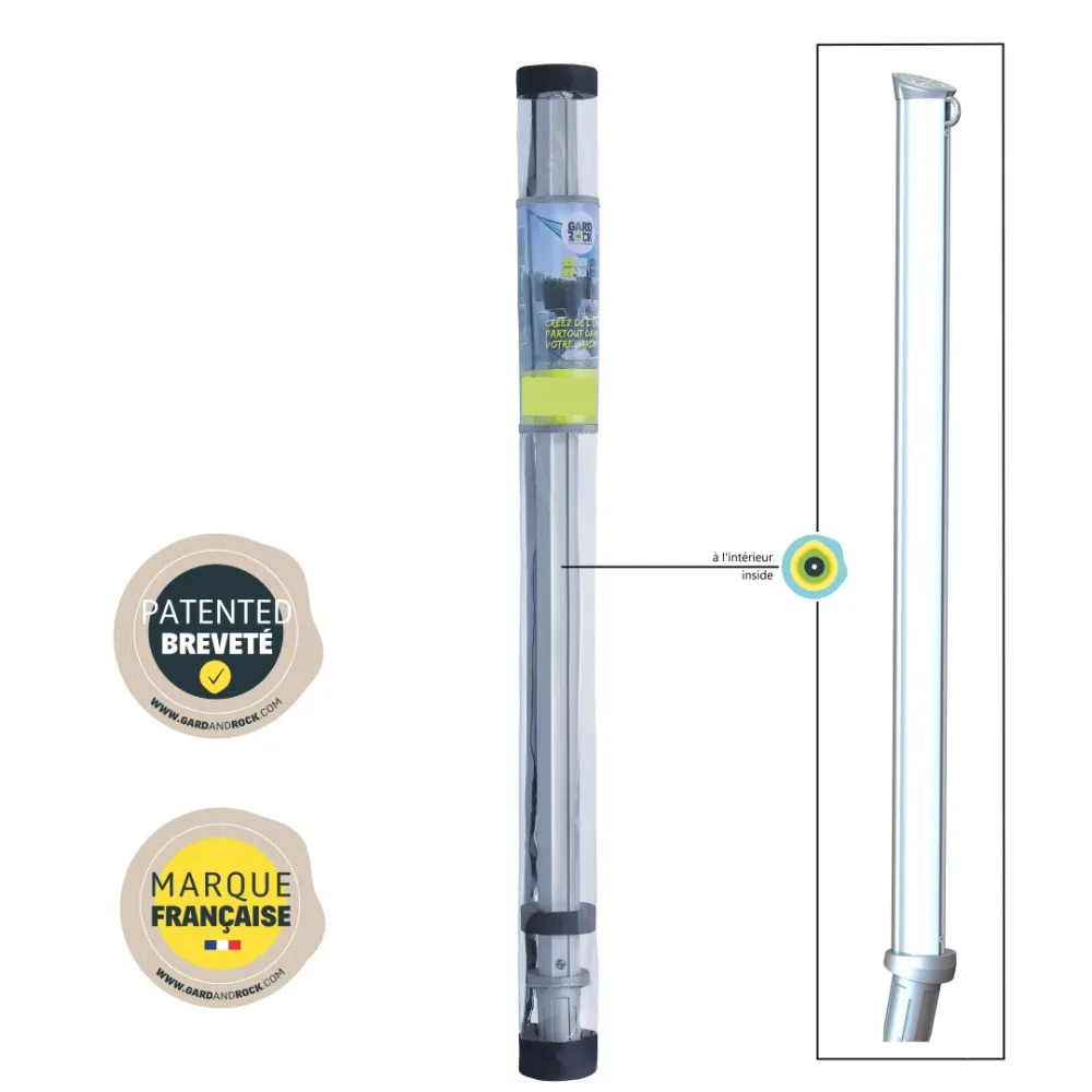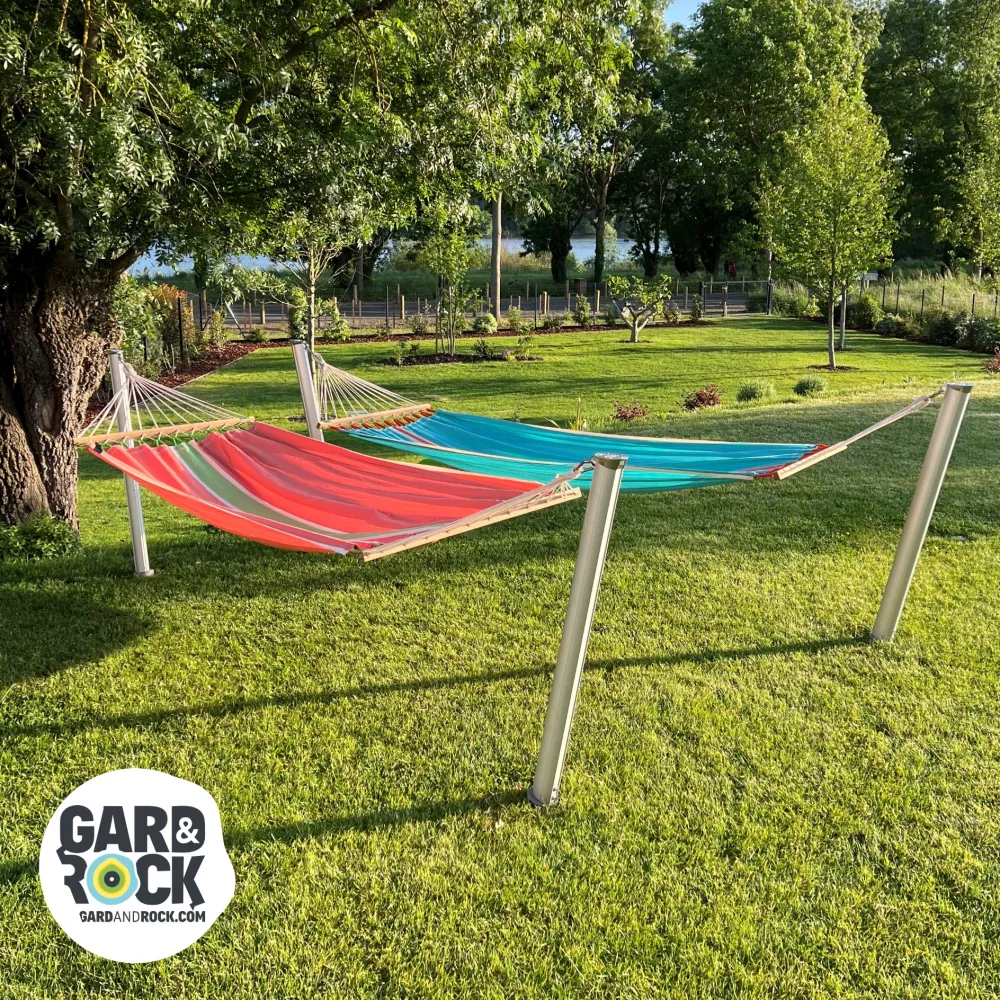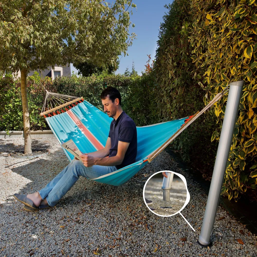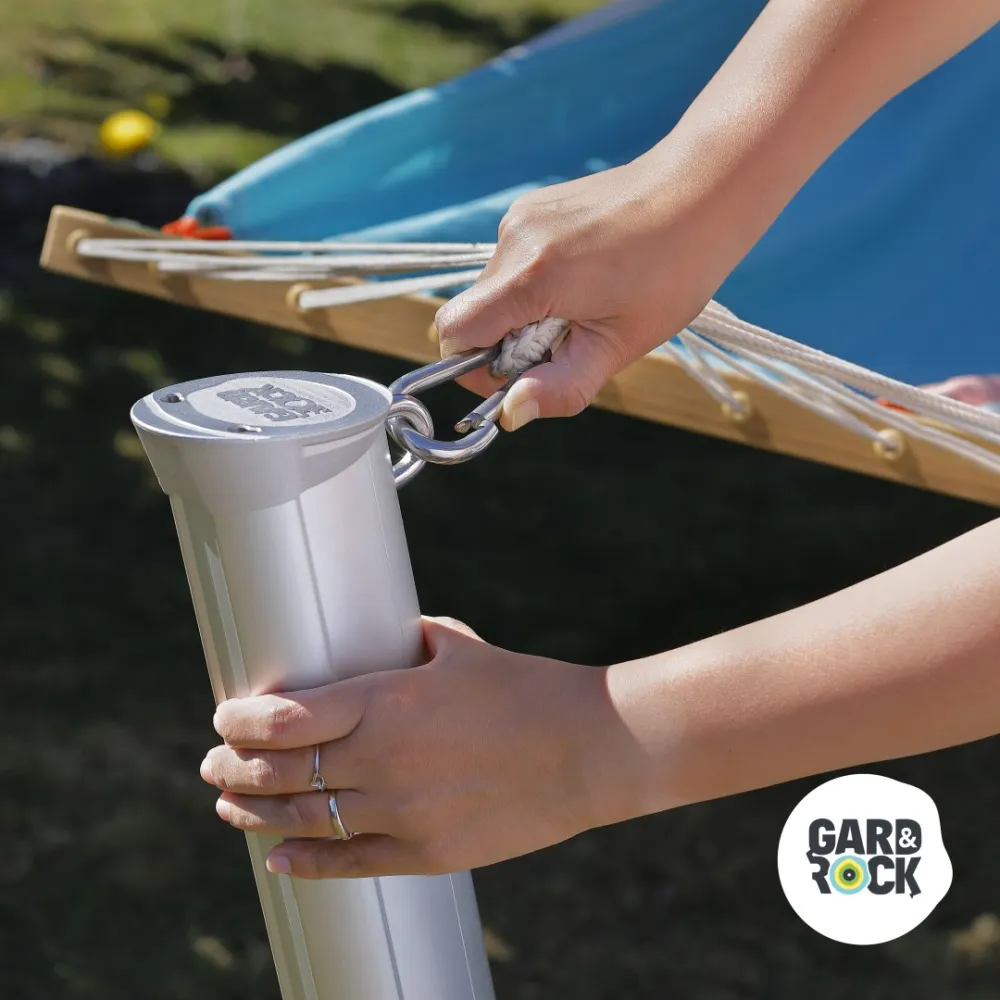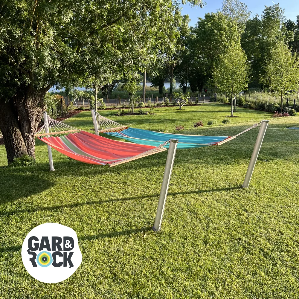 De GARD&ROCK-palen zorgen voor een snelle en gemakkelijke bevestiging van uw hangmat overal in un buitenruimte (terras, gazon, zwembadrand...). Ons gepatenteerd systeem biedt een verwijderbare verankering om uw inrichting te moduleren of uw terrein in een oogwenk vrij te maken. Al dan niet in combinatie met een boom, hebt u meerdere mogelijkheden om de ideale plaats te vinden om u in alle rust te ontspannen. U geniet van een stijlvol en stevig product van hoge kwaliteit dat in Frankrijk ontorpen is. Een onmisbaar accessoire om aangename momenten in uw tuin door te brengen.